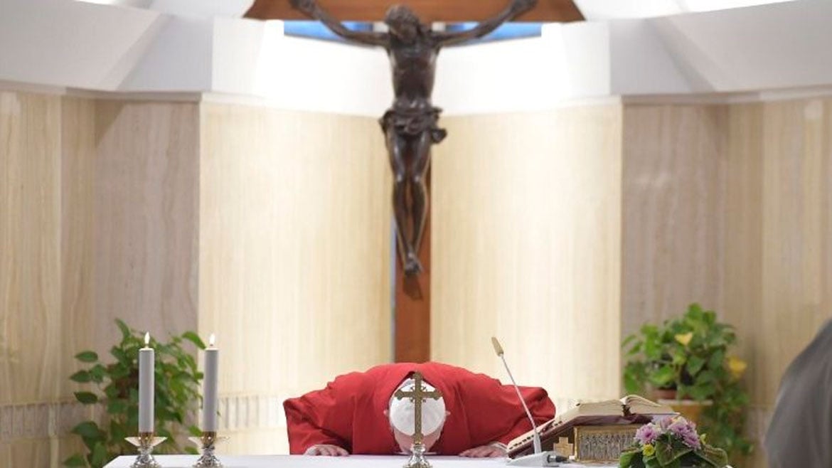 El Papa ha invitado a la contemplación del fracaso y a que no temamos a los “malos tiempos que pueden ser iluminados por la misma cruz, signo de la victoria de Dios sobre el mal. Un mal, Satanás, que está destruido y encadenado, pero sigue ladrando y si te acercas a acariciarlo te destruirá. No tengamos miedo de contemplar la cruz como un momento de derrota, de fracaso”.
