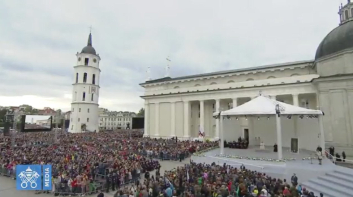 No ha sido una JMJ, pero casi. El mismo entusiasmo -o más-, se ha podido percibir Francisco por parte de los jóvenes lituanos que le esperaban en la plaza de la catedral de Vilna, en la primera jornada de su viaje a los países bálticos. Tras escuchar el testimonio de dos jóvenes -Mónica, que habló de la muerte de su padre, y Jonás, que compartió cómo vive la enfermedad-, el Papa quiso abrir su alocución a la multitud en tono coloquial: “He recibido vuestras palabras como un amigo, como si hubiéramos estado sentados juntos, en algún bar, contándonos cosas de la vida, mientras tomamos una cerveza o una ‘gira’ -una bebida no alcohólica típicamente polaca- después de haber ido al teatro Jaunimo”.