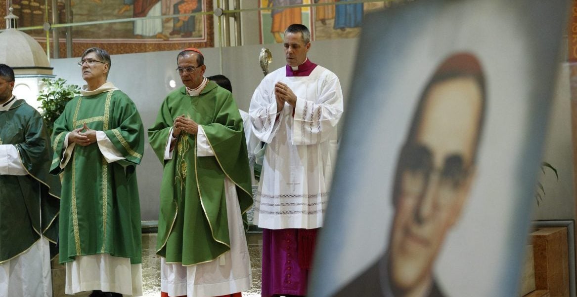 El cardenal Gregorio Rosa Chávez celebra la eucaristía ante el retrato de Óscar Romero/CNS