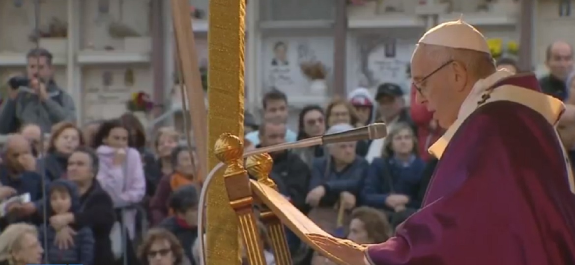 “En este cementerio están las tres dimensiones de la vida”, ha dicho Francisco durante la homilía. Unas dimensiones “que incluso los niños entienden, y que son el pasado, el futuro y el presente”. El Papa señaló que “en lo que se refiere al pasado, hoy es un día de memoria, para recordar a aquellos que caminaron entre nosotros, que nos han acompañado y que nos han dado la vida”.