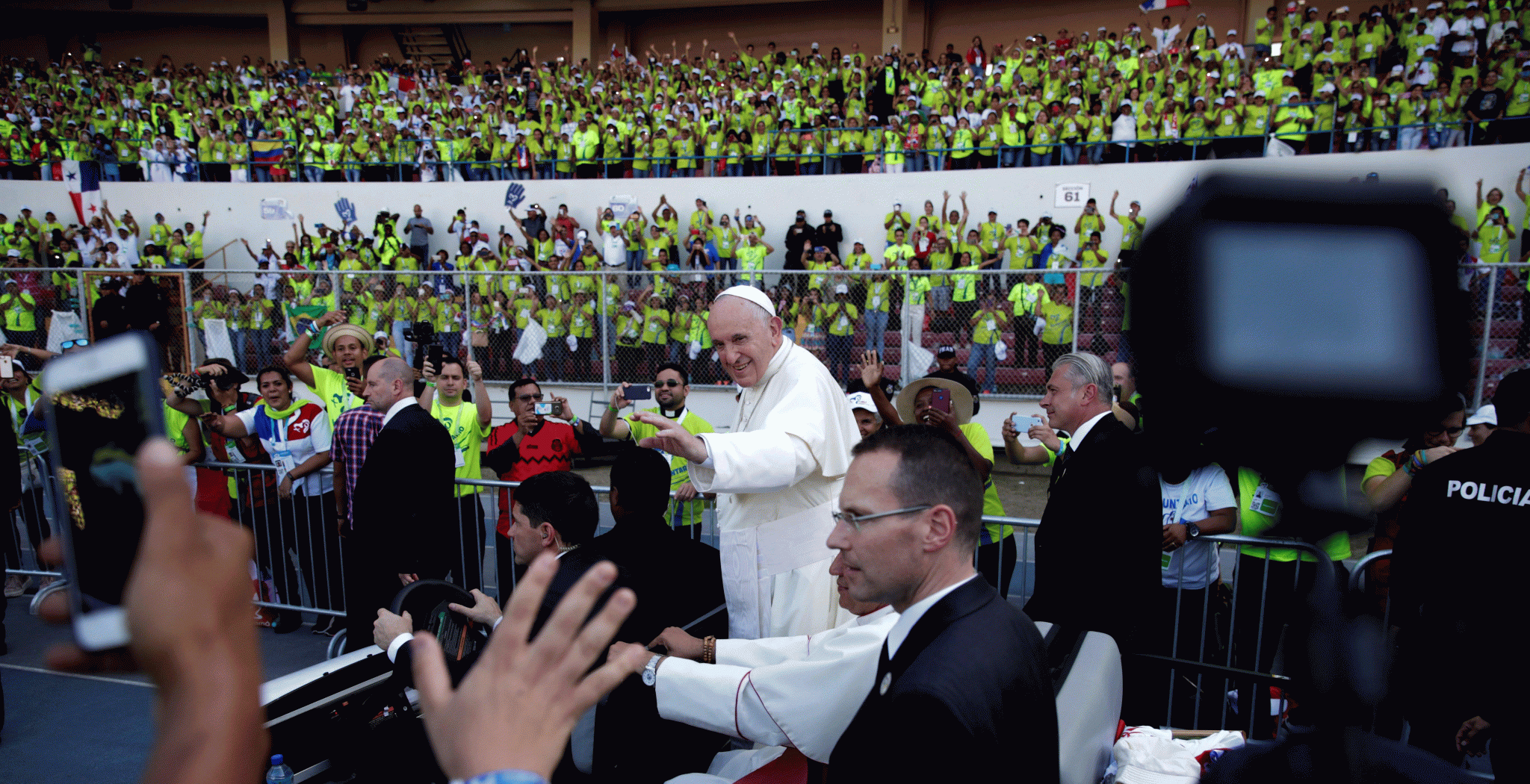 Encuentro con los voluntarios de la JMJ de Panamá en el Estadio Rommel Fernández. Turno, una vez más, para la improvisación. El papa Francisco ha querido compartir con todos una de las anécdotas de este encuentro. Se topó con una anciana que portaba un cartel que rezaba así: “Santidad, las abuelas también hacemos lio”. Se acercó a hablar con ella. Le pareció mayor y le preguntó su edad. “Tenía 14 años menos que yo. ¡Qué vergüenza!”, ha dicho, provocando las risas de los voluntarios. Ella hace “lío con sabiduría”: “Por favor, júntense con los abuelos para armar lío”.