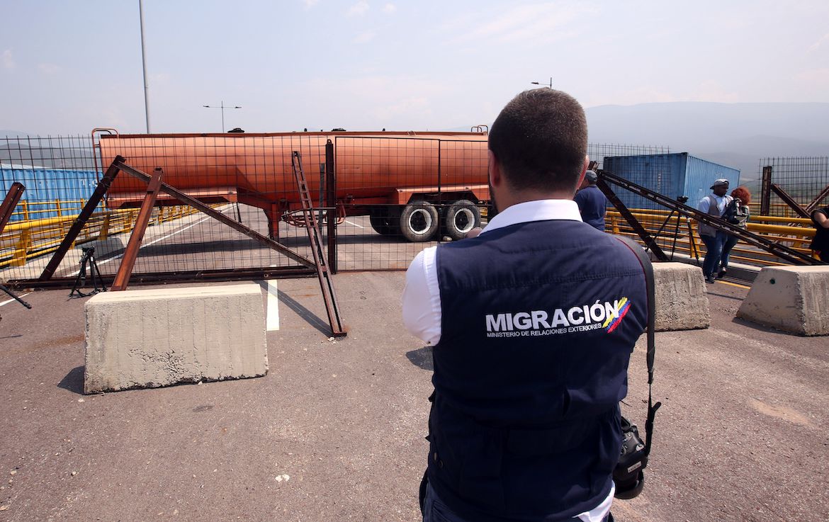 AME9032. CÚCUTA (COLOMBIA), 06/02/2019.- Funcionarios de Migración Colombia observan el bloqueo del puente Tienditas este miércoles, sector Boconó, en Cúcuta (Colombia). La Guardia venezolana bloquea este puente en desuso para evitar el ingreso de la ayuda humanitaria anunciada por el presidente de la Asamblea Nacional, Juan Guaidó, el pasado sábado. Si bien el puente fue inaugurado en 2016 se encuentra en desuso debido a los cierres de la frontera constantes, informaron vecinos a Efe. EFE/ Mauricio Dueñas
