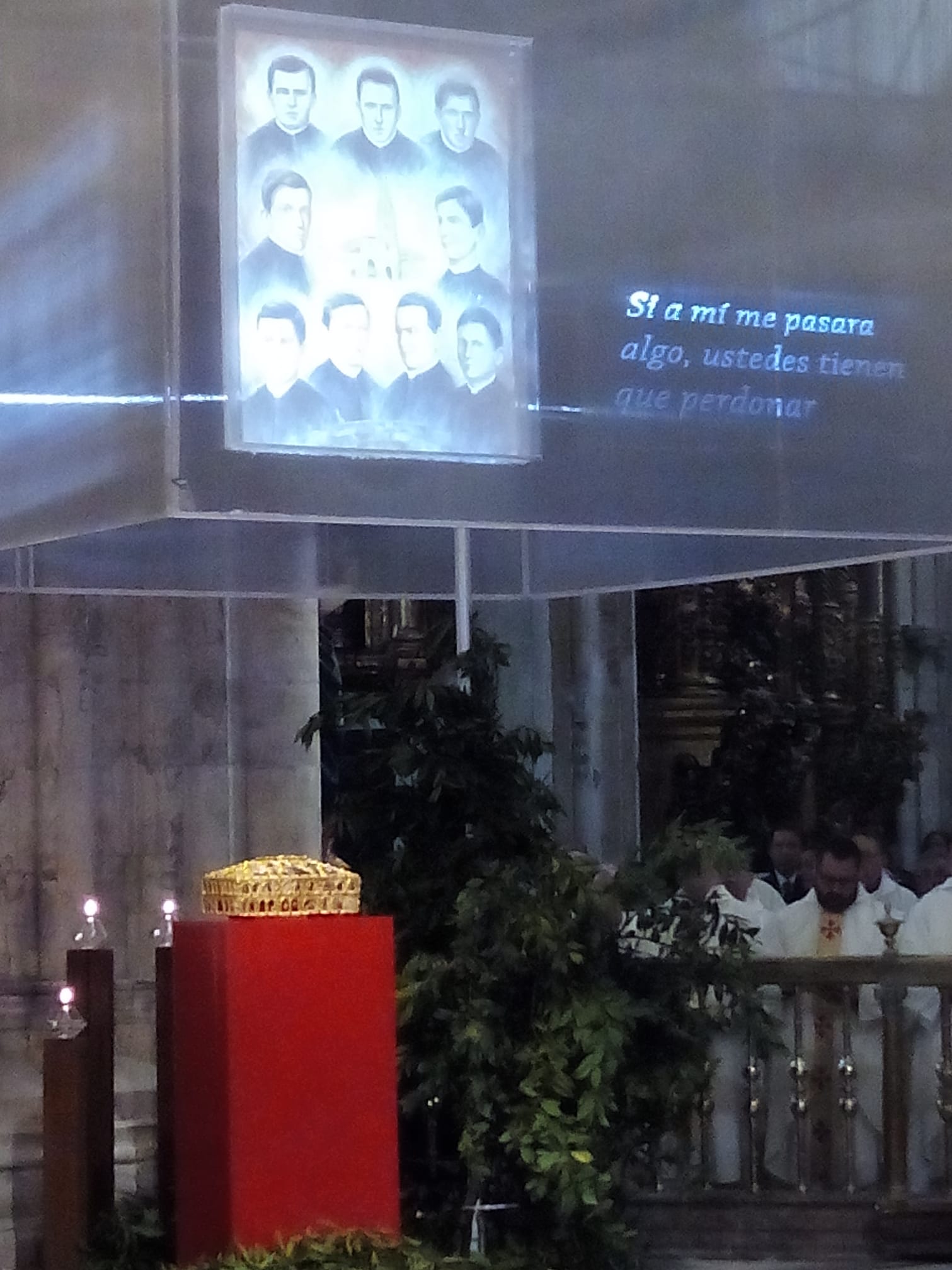 Tras la lectura del ‘mandato’ del papa Francisco autorizando la inscripción de los seminaristas mártires en la lista de los beatos de la Iglesia, pasadas las 11:30 h. han sido beatificados. En esta ocasión el tradicional tapiz con la imagen de los nuevos beatos se proyectó sobre el presbiterio de la catedral. Además las reliquias se veneraron en una de las principales joyas de la Cámara Santa de la catedral, la Caja de las Ágatas que fue portada por algunos de los seminaristas actuales.