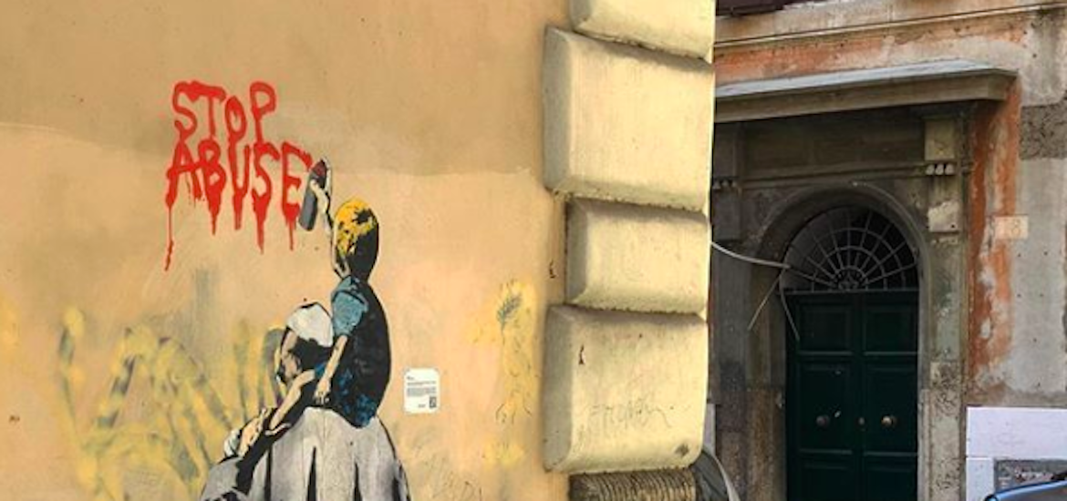 Una pared de Vicolo degli Osti (Roma) ha sido el lienzo elegido por el artista italiano TvBoy para denunciar la situación de los abusos sexuales en el seno de la Iglesia católica, así como para poner en valor la labor del papa Francisco en este asunto. Así, ha retratado en un mural a un niño sobre los hombros del Papa, que le sostiene mientras el pequeño escribe “Stop Abuse” en el muro.