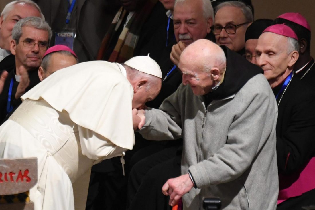 Uno de los momentos más bellos del encuentro se ha dado cuando el Papa ha saludado a Jean-Pierre Schumacher, superviviente, en 1996, de la matanza de los monjes trapenses del monasterio argelino de Tibhirine, hoy beatos. Con gran emoción, Francisco se ha postrado ante él mientras la catedral entera se llenaba de aplausos.