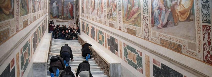 Allí, en el siglo IV, se situó cerca de lo que hoy es la basílica de San Juan de Letrán. Desde entonces ha sido un punto clave en las peregrinaciones cristianas a la Ciudad Eterna. Aunque llegó un momento, a inicios del siglo XVIII, en que se optó por tapar el mármol con madera para evitar el desgaste de la escalera original. Y es que, desde el primer momento, los fieles que subían las escaleras lo hacían de rodillas.