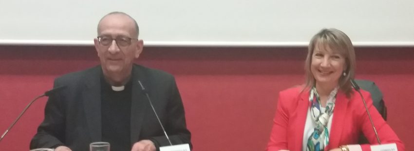 El cardenal arzobispo de Barcelona, que fue presentado en el salón de actos de la Universidad Pontificia Comillas por la presidenta de la AEC, Lourdes Ruano, reivindicó desde el primer momento la figura del papa Francisco, que “nos ha invitado desde el principio a llevar el gozo y alegría de evangelizar, porque estamos viviendo en una sociedad y en una Iglesia donde todo es desilusión”.
