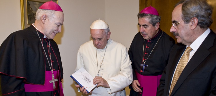 Carlos Aguiar, Santiago Silva y Aurelio Matos entregan al papa Francisco en 2015 el Nuevo Testamento de la BIA