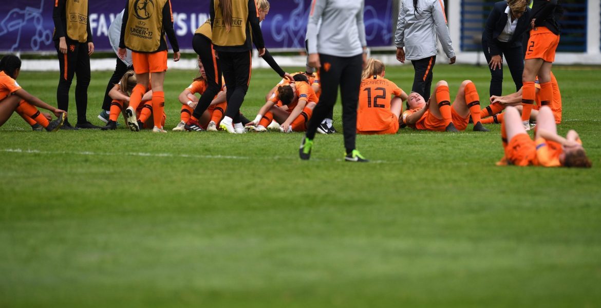 VAS01. ALBENA (BULGARIA), 17/05/2019.- Las jugadoras de la selección holandesa muestran su decepción tras perder ante Alemania en la final del Europeo femenino sub-17, que se ha disputado este viernes en Albena (Bulgaria). EFE/ Vassil Donev