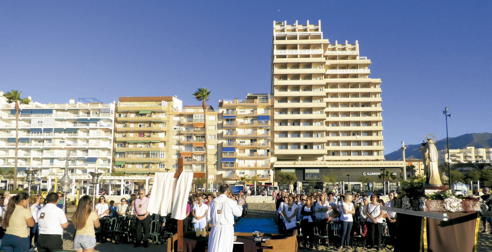 La acción de la parroquia de Fuengirola tiene un punto excepcional el 16 de julio, festividad de la Virgen del Carmen (la Stella Maris): “Ese día es increíble la cantidad de gente que viene; empiezan a llenarse los bancos dos horas antes de la misa, que es al mediodía. Luego, por la tarde, la procesión cruza nuestras calles y llega a la playa. Allí, los 120 marinos que portan la imagen se meten al agua con ella, avanzando a pie. Yo también la sigo, llevando el bañador bajo el alba. Es muy emotivo”.