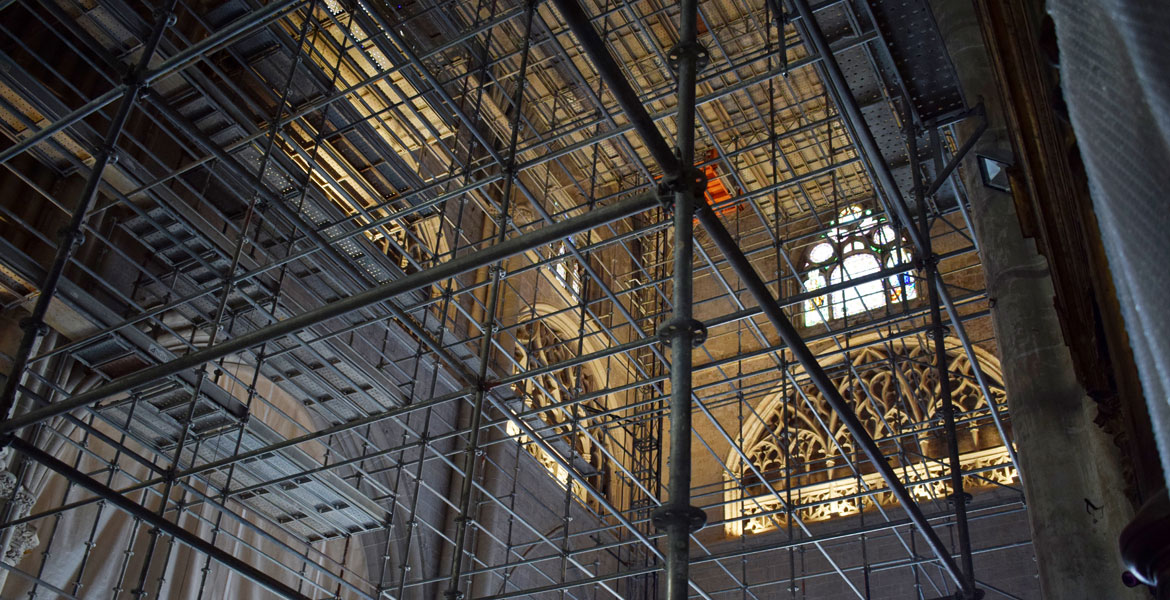 El canónigo fabriquero hace de guía, enseña y explica: “Son obras muy significativas porque hace más de cien años que no se realizan aquí obras de esta importancia”. Y enumera: “¿En qué consisten? En la restauración de bóvedas de las naves, de capillas, de paramentos, de la torre y la fachada occidental, que son obras de cantería. También se lleva a cabo no solo la restauración de las bóvedas, sino toda la decoración renacentista. Esos pinjantes del siglo XVI, las decoraciones que se ponían en la intercesión de los nervios de la clave de las bóvedas, son extraordinarios”.