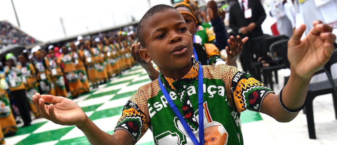 Tras recorrer kilómetros de arrabales miseros y polvorientos, hemos llegado con varias horas de antelación a la llegada del Papa. Los cincuenta mil puestos ya estaban ocupados por personas de todas las edades, muchos de los cuales habían pasado allí la noche. Todos ataviados con vestidos multicolores cantaban y danzaban al ritmo sincopado de una música a todo volumen.