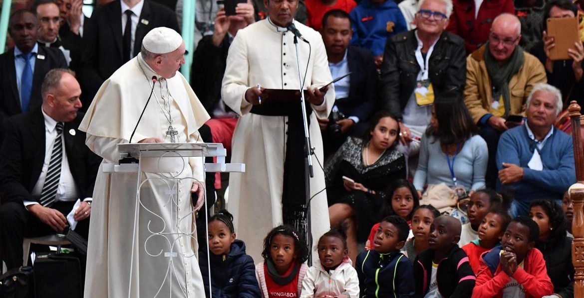 Akamasoa (Madagascar), 08/09/2019.- Pope Francis (L) delivers a speech during his visit to the City of Friendship, in Akamasoa, Madagascar, 08 September 2019. Pope Francis will visit Mozambique, Madagascar, Mauritius on his three-nation trip to Africa, from 04 to 10 September 2019. (Papa, Mauricio) EFE/EPA/LUCA ZENNARO