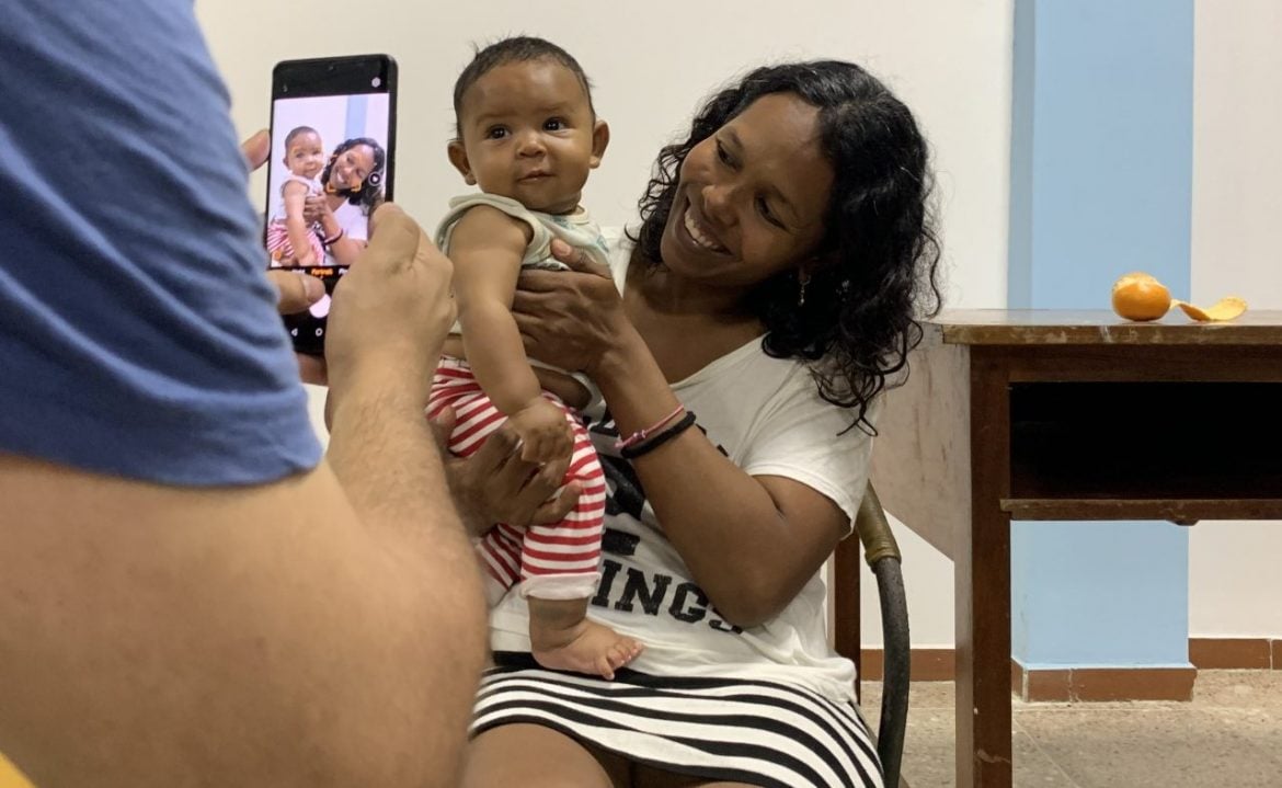 “Salí de Venezuela por la situación económica”, dice Carmen, de 36 años. Lo hice con sus tres hijos y su hermano. Un saldo de 17 días andando por Colombia, donde “los hermanos colombianos nos ayudaron mucho”. Ella relata su historia sin perder la sonrisa, con su pequeño de tres meses, Axel Josué, en brazos.