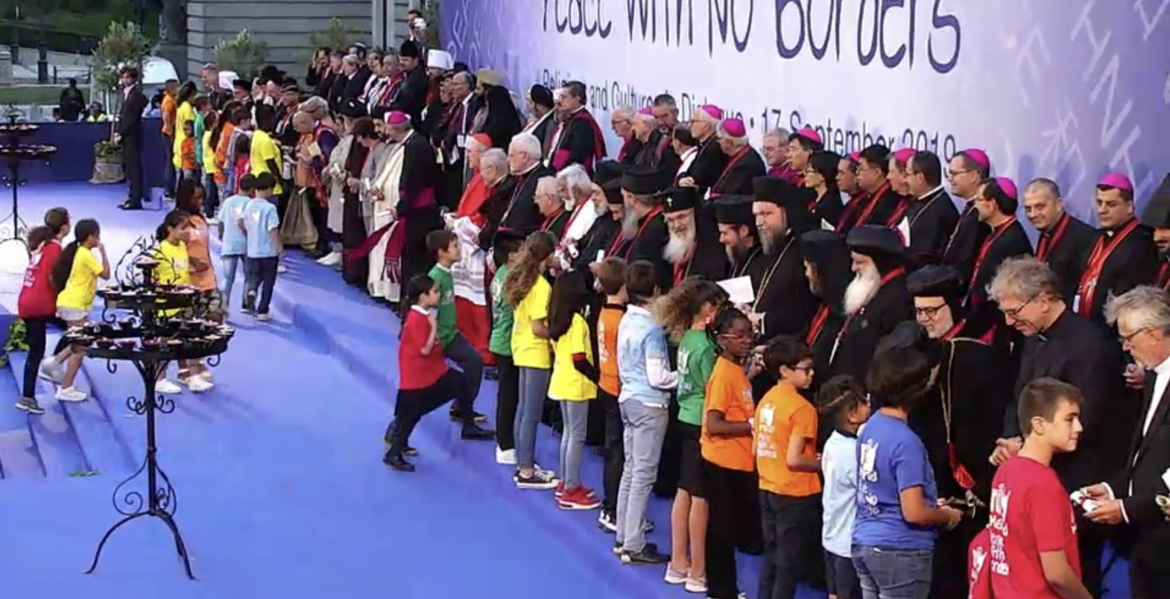 Un grupo de niños entrega el manifiesto por la paz a los líderes religiosos