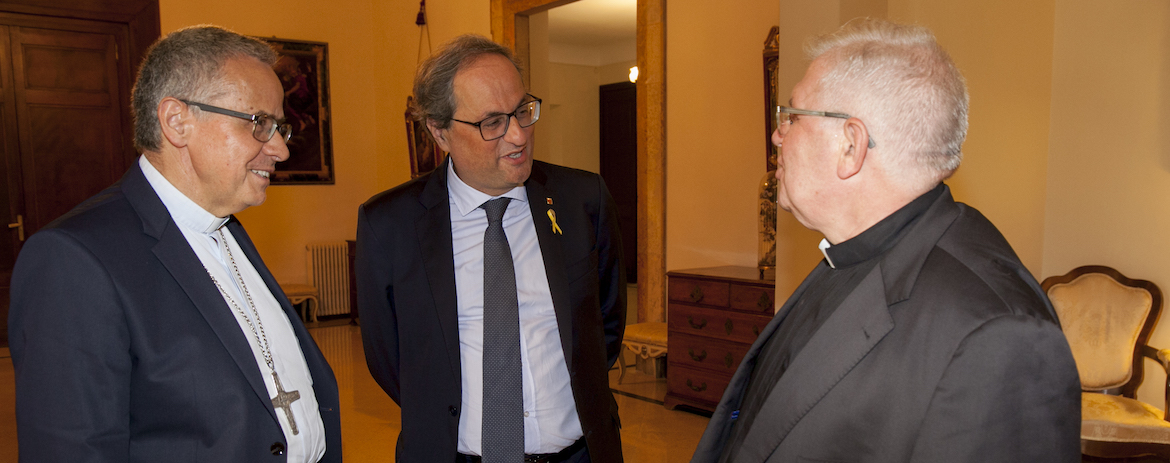 El arzobispo de Tarragona, Joan Planellas, ha recibido este lunes, 23 de septiembre, al presidente de la Generalitat de Catalunya, Joaquim Torra, en el palacio arzobispal con motivo de la festividad de Santa Tecla. Una fecha que no solo representa la fiesta mayor de Tarragona, sino que, tal como ha señalado el arzobispo, representa a una santa en la que se cimientan “las raíces cristianas”, así como en la “misma predicación del apóstol san Pablo”, de quien fue discípula.