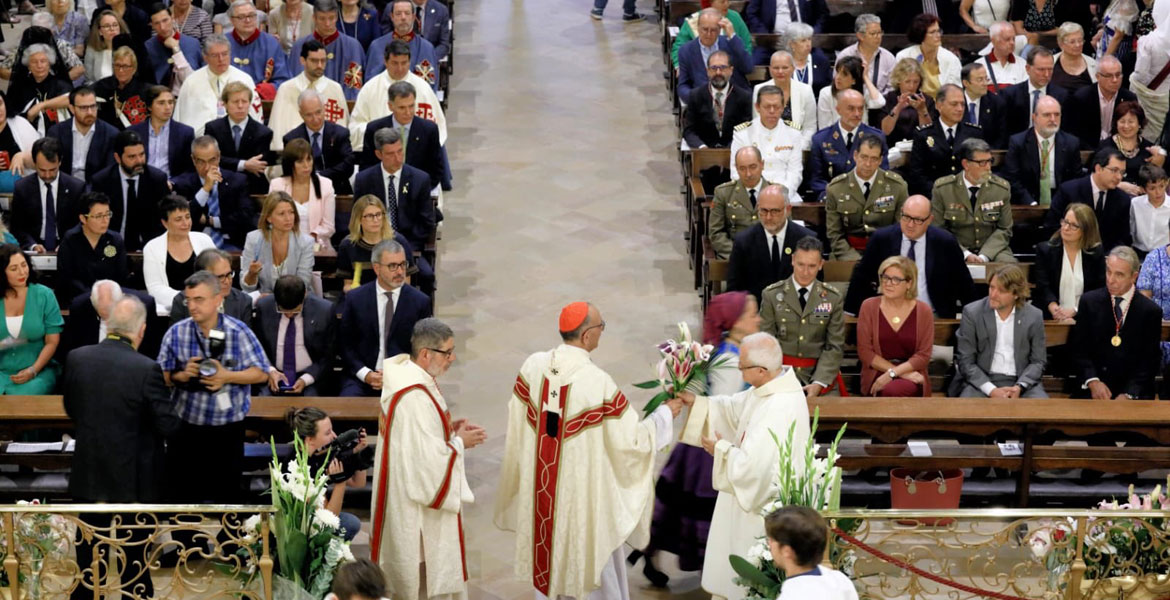 Misa solemne en la basílica de la Virgen de la Mercè con motivo de la festividad de la patrona de Barcelona. Homilía del cardenal arzobispo, Juan José Omella. Autoridades civiles y militares presentes. Ni una palabra sobre la noticia que ha abierto todos los informativos la víspera. La detención de un grupo de sospechosos de estar preparando acciones terroristas con motivo del segundo aniversario del 1-O y en vísperas de la sentencia del juicio a los líderes políticos del denominado procés soberanista.