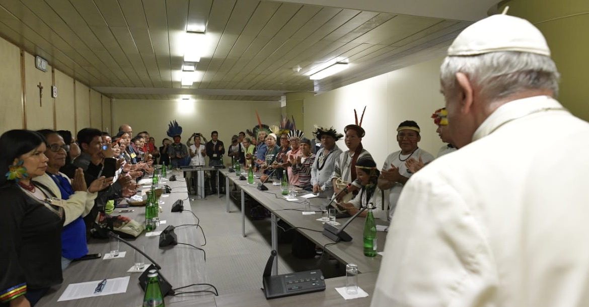 El encuentro tuvo lugar a las 3:30 p.m. Entre los participantes estaban los indígenas participantes de la Asamblea Especial del Sínodo de los Obispos para la Región Panamazónica, así como algunos indígenas vinculados a otras iniciativas y procesos socio-eclesiales que se han visibilizado por estos días en la Ciudad Eterna. También estuvieron presentes el cardenal brasileño Claudio Hummes, presidente de la Red Eclesial Panamazónica (REPAM), y el arzobispo de Porto Velho y presidente del Consejo Indigenista Misionero (CIMI), Roque Paloschi.