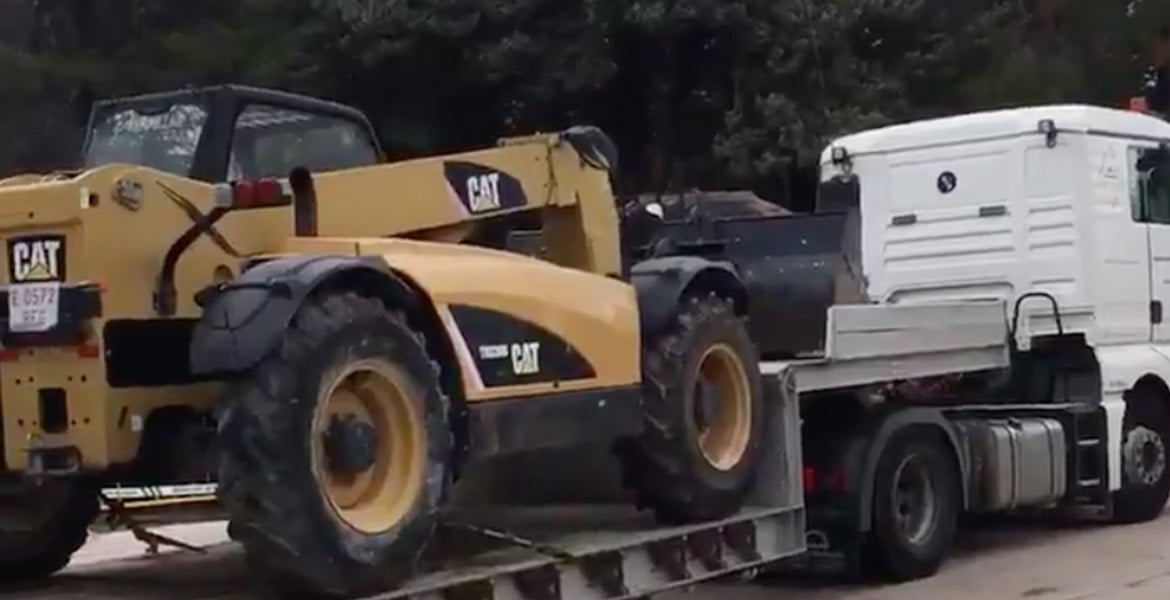 Poco después de que se cumpliese la hora, hacían su entrada en el complejo dos furgonetas y dos camiones trasladando ya parte de la maquinaria pesada necesaria para las labores relacionadas con la exhumación del féretro de Francisco Franco. Entre la maquinaria se encontraba una manipuladora telescópica de ruedas con pala de la marca Caterpillar, tal como puede verse en los vídeos publicados en las redes sociales por la propia Hospedería del Valle señalando que “a las 14:50 horas ha entrado en El Valle maquinaria pesada para proceder a la profanación”.
