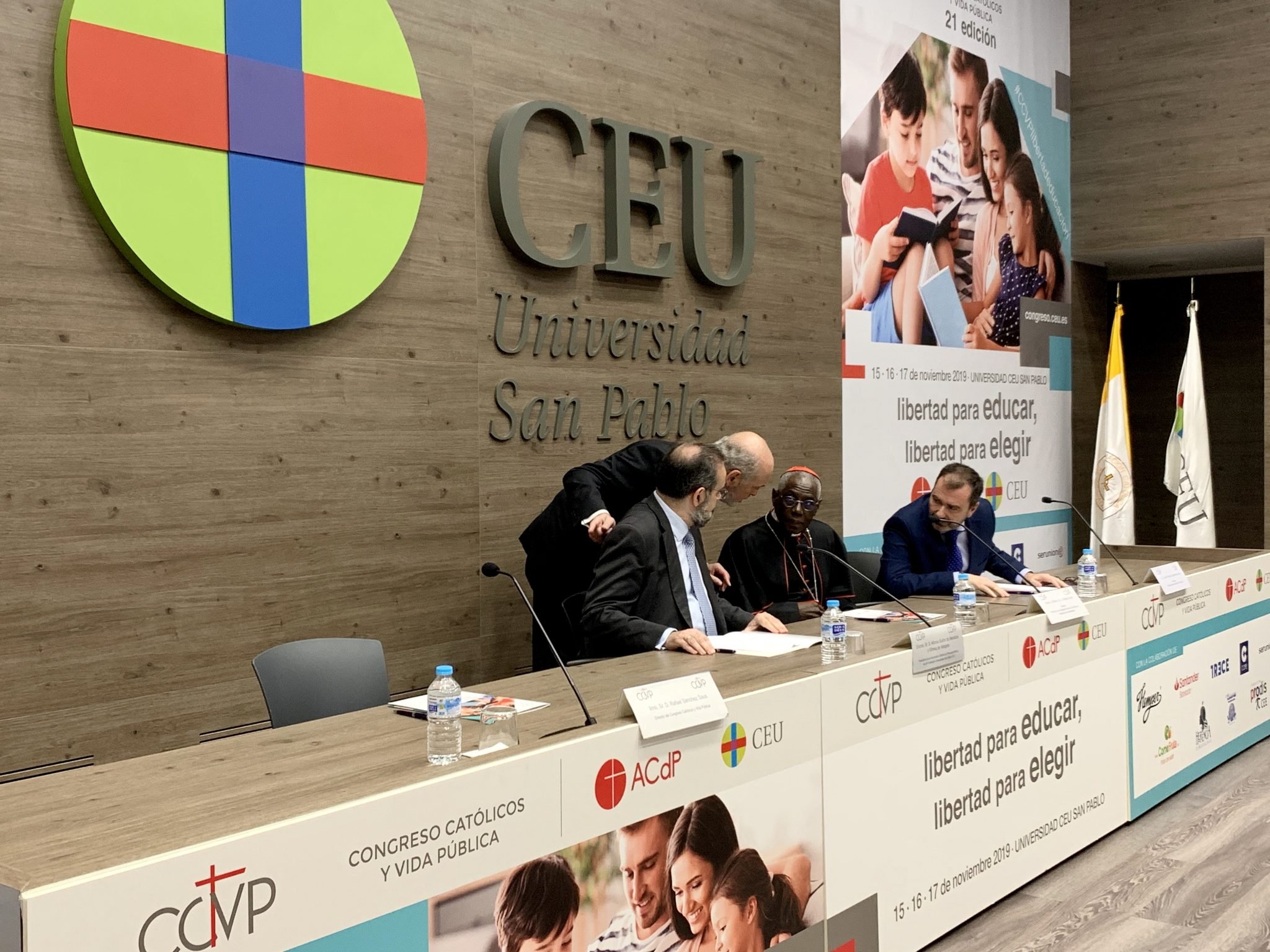 Durante su ponencia, el cardenal curial solo ha citado en una ocasión al Papa para hacer referencia a la ideología de género y no ha aludido en ningún momento a la apuesta educadora de Francisco: el pacto global por la educación.