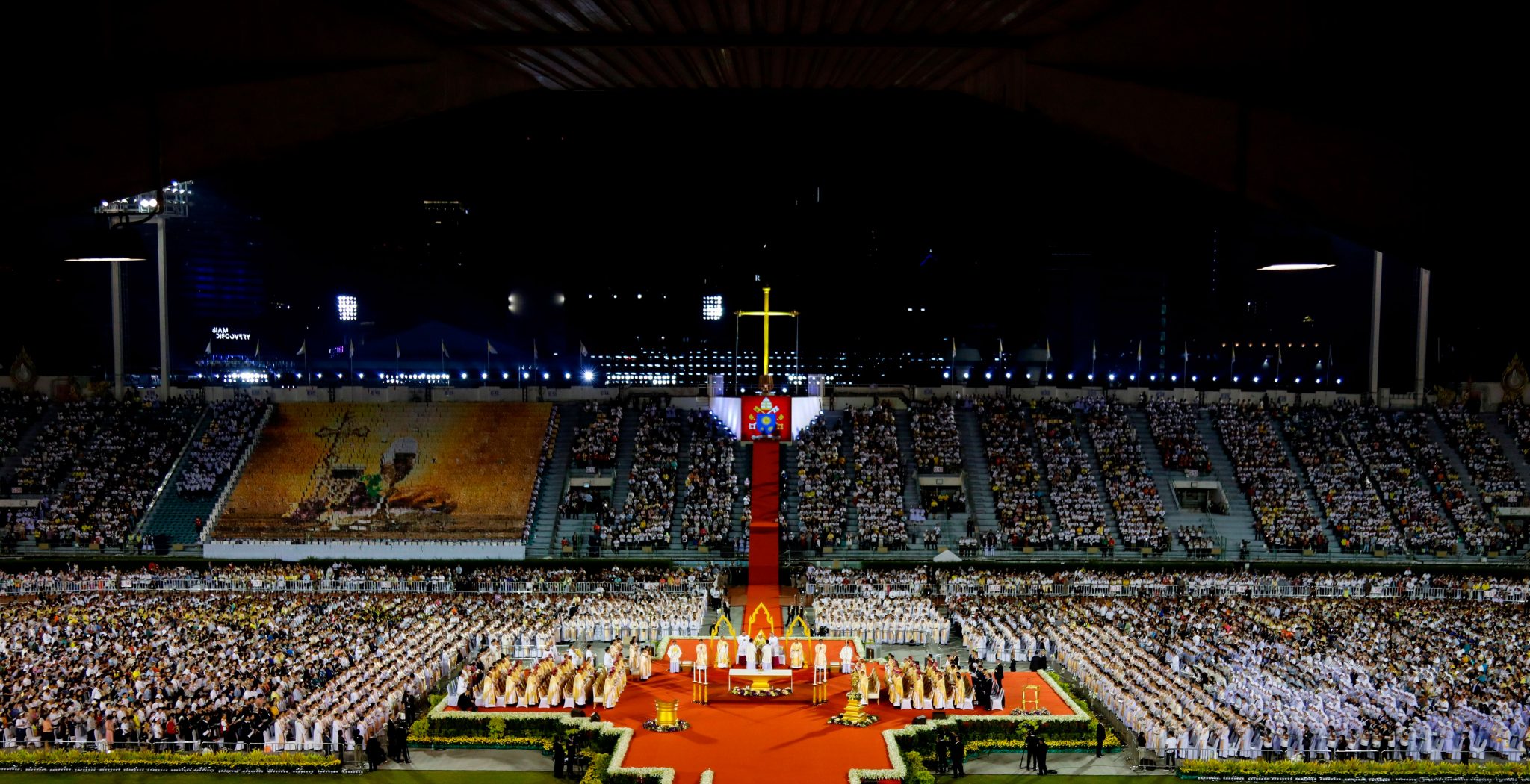 Paradójicamente la noche cayó casi de repente sobre Bangkok cuando a las 6 de la tarde Francisco hizo su entrada en el estadio Rajamangala entre salvas de aclamaciones y un incesante agitar de banderitas vaticanas y tailandesas. Construido en 1998 para albergar los Juegos Asiáticos, este singular edificio ha vivido hoy una de las jornadas más excepcionales de su historia. Ni un solo asiento –de los 65.000 de que dispone– ha quedado vacío; la enorme masa, si se tiene en cuenta que los católicos en este país no llegan a los 400.000, la componían también fieles procedentes de los limítrofes Laos, Camboya y Myanmar así como también de Vietnam; incluso hemos podido divisar varias banderas chinas.