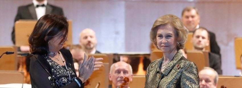 La presidenta de la ONG de la Iglesia, Clara Pardo, fue la encargada de entregar el galardón a la Reina emérita durante el concierto ‘Música de cine por un Nuevo Mundo’ de la Orquesta Sinfónica Nacional Checa, con el que Manos Unidas conmemora el 60 aniversario de su nacimiento, y que tuvo lugar en la Sala Sinfónica del Auditorio Nacional de Música de Madrid.