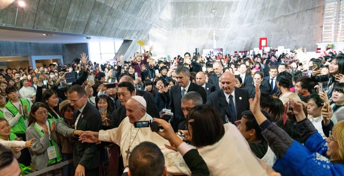Con la canción ‘Pescador de hombres’ interpretada en japonés de fondo, el papa Francisco se adentraba hoy en la catedral de La Inmaculada de Tokio, uno de los templos que tuvo que ser reconstruido tras los bombardeos de la II Guerra Mundial. En su interior le esperaban 900 jóvenes que le recibieron con una constante ovación hasta que tomaron la palabra en su nombre, Miki –católica–, Masako –budista– y Leonardo –migrante filipino–.