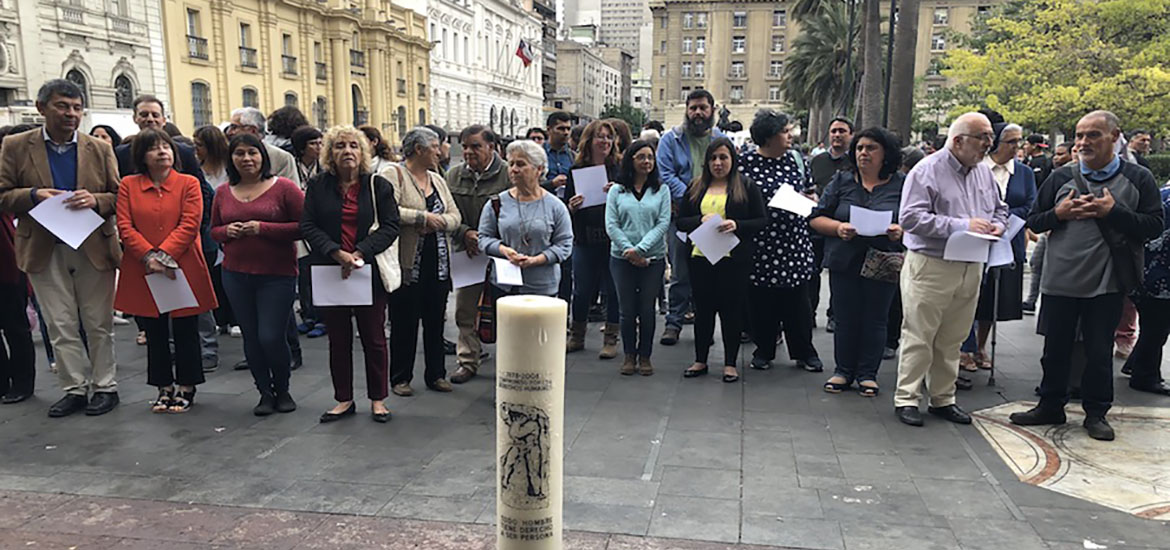 Mientras, en la Plaza de Armas de Santiago, un grupo pequeño realizó un acto significativo. Animado por Ruth, trabajadora de la ex Vicaría de la Solidaridad del Arzobispado, el grupo se reunió en torno a un cirio en el atrio de la Catedral. Ruth empezó diciendo: “Hoy, con profundo dolor por estar viviendo tiempos de injusticias y de ausencia de paz, realizaremos juntos el mismo rito”, refiriéndose al compromiso por el respeto de los derechos fundamentales adoptado hace 41 años y renovado cada año.