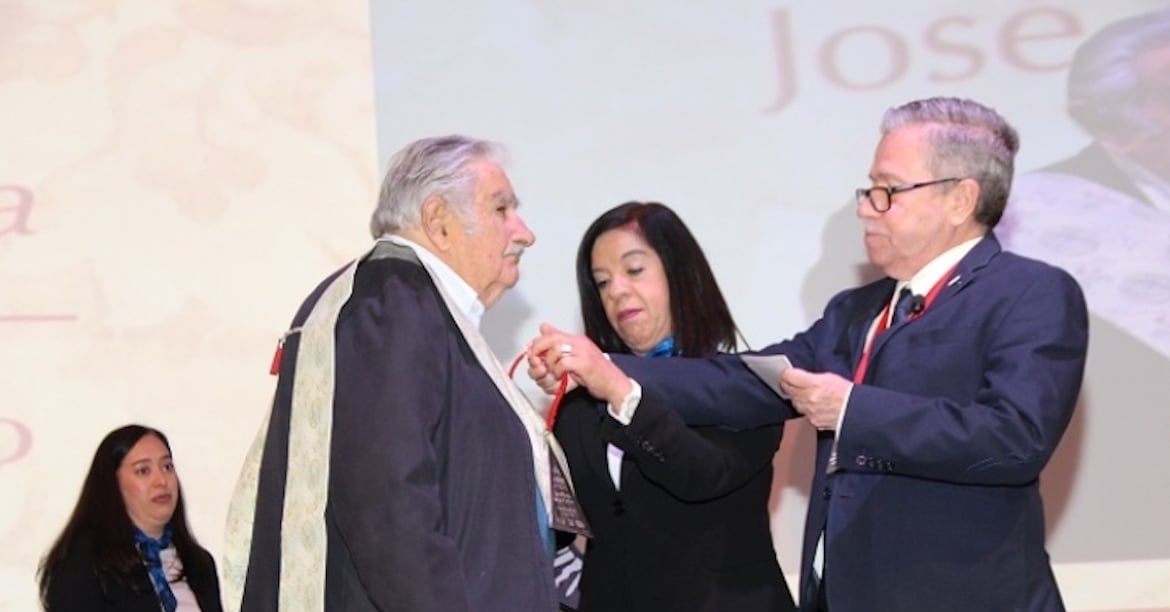 Durante el acto, el maestro David Fernández Dávalos, rector de la Universidad IBERO CDMX-Tijuana, entregó a nombre de las instituciones que forman el SUJ el grado de Doctor ‘Honoris Causa’ a ‘Pepe’ Mujica, a quien colocó la beca y la medalla con la leyenda “Dios puso al mundo para ser pensado”.