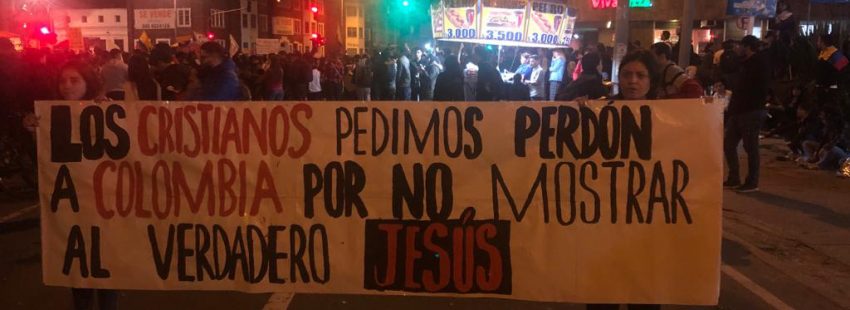 En este mar de expresiones encontré en una de las esquinas del parque, a un disruptivo grupo de jóvenes que sostenían varios carteles: “los cristianos pedimos perdón a Colombia por no mostrar al verdadero Jesús“, rezaba una pancarta que ocupaba buena parte de la carrera séptima.