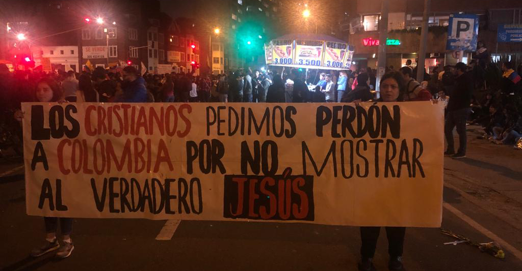 En este mar de expresiones encontré en una de las esquinas del parque, a un disruptivo grupo de jóvenes que sostenían varios carteles: “los cristianos pedimos perdón a Colombia por no mostrar al verdadero Jesús“, rezaba una pancarta que ocupaba buena parte de la carrera séptima.