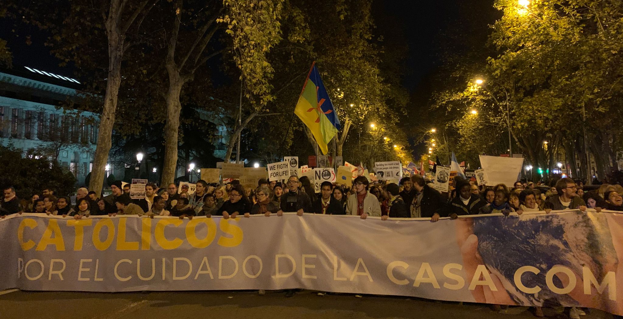 En medio del espacio destinado por la organización para las organizaciones sociales, que marcharon antes que los partidos políticos, se congregó la marea católica bajo la pancarta ‘Católicos por el cuidado de la Casa común’, una pancarta que provocó extrañeza en algunos manifestantes. “¿Católicos?”. Sí, católicos.