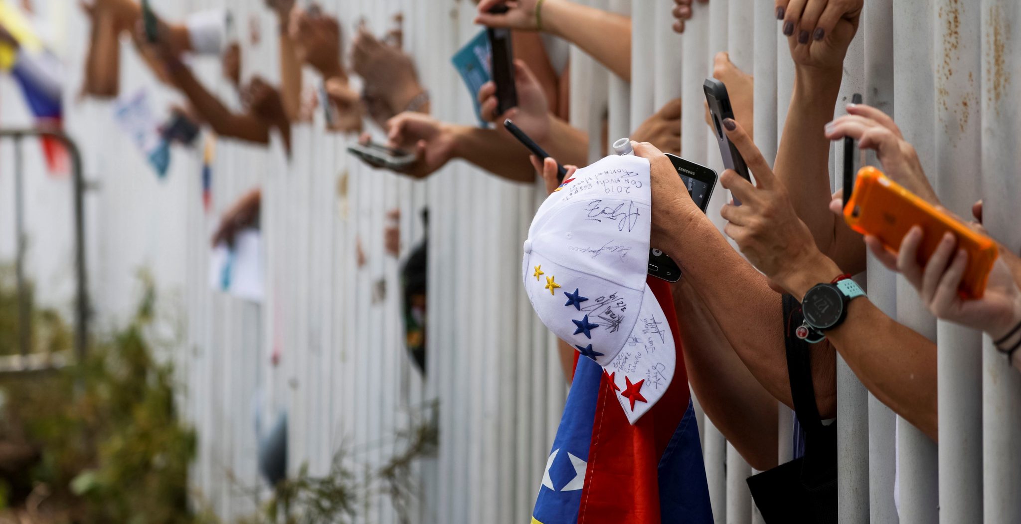 AME4532. CARACAS (VENEZUELA), 16/02/2019.- Voluntarios para trabajos de ayuda humanitaria asisten a un acto con el jefe del Parlamento y presidente interino de Venezuela, Juan Guaidó (no en la foto) este miércoles en la sede del periódico El Nacional en Caracas (Venezuela). Juan Guaidó, quien se proclamó presidente encargado, dijo este sábado estar dispuesto a "hacer lo necesario" para lograr el ingreso de las ayudas almacenadas en la ciudad colombiana de Cúcuta, y que servirán para paliar la crisis humanitaria que, asegura, atraviesa el país. EFE/ Miguel Gutiérrez