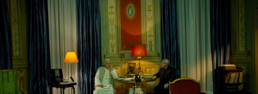 Si bien la obra de Meirelles, protagonizada por Anthony Hopkins (en el papel de Joseph Ratzinger) y Jonathan Pryce (Jorge Mario Bergoglio), está “inspirada en una historia verdadera”, relata, con una interpretación libre que subraya la humanidad de ambos pontífices, acontecimientos reales como la dimisión de Benedicto XVI y el nombramiento del papa Francisco.