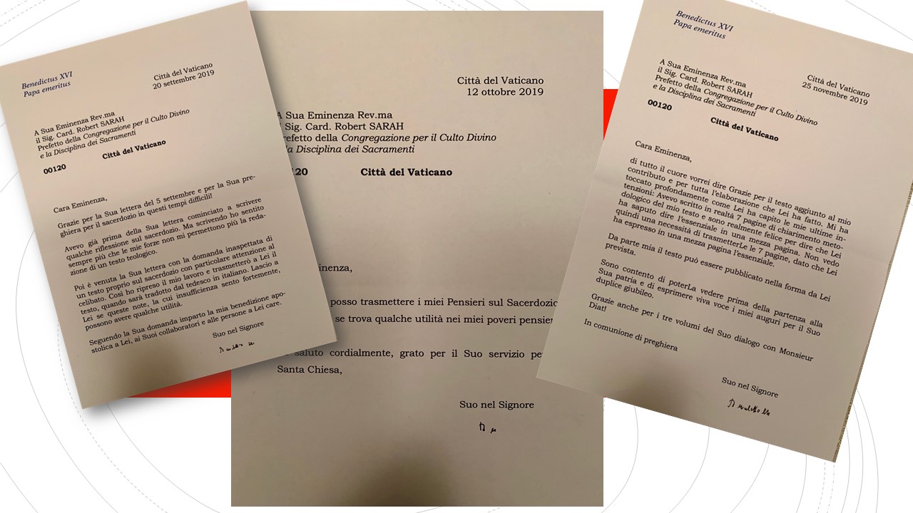 “Esta noche doy las pruebas de mi estrecha colaboración con Benedicto XVI para escribir este texto a favor del celibato. Hablaré mañana si es necesario”, relata el purpurado, que adjunta tres imágenes de tres cartas del Papa emérito escritas a máquina y firmadas por él. En estas misivas, se corrobora que Ratzinger colaboró de alguna manera en el envío de unos textos al cardenal Sarah, pero no acabarían de confirmar si el Papa emérito dio su autorización expresa para publicarlos en un libro a cuatro manos ni conocería la versión definitiva de la obra conjunta.