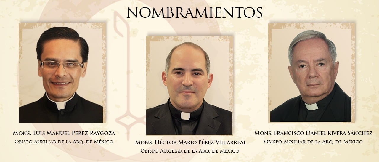 Los nuevos obispos son: el sacerdote Luis Manuel Pérez Raygoza, del clero de la Arquidiócesis de México, el sacerdote Héctor Mario Pérez Villarreal, del clero de la Arquidiócesis de Monterrey, y el reverendo padre Francisco Daniel Rivera Sánchez, superior general del Instituto de los Misioneros del Espíritu Santo.