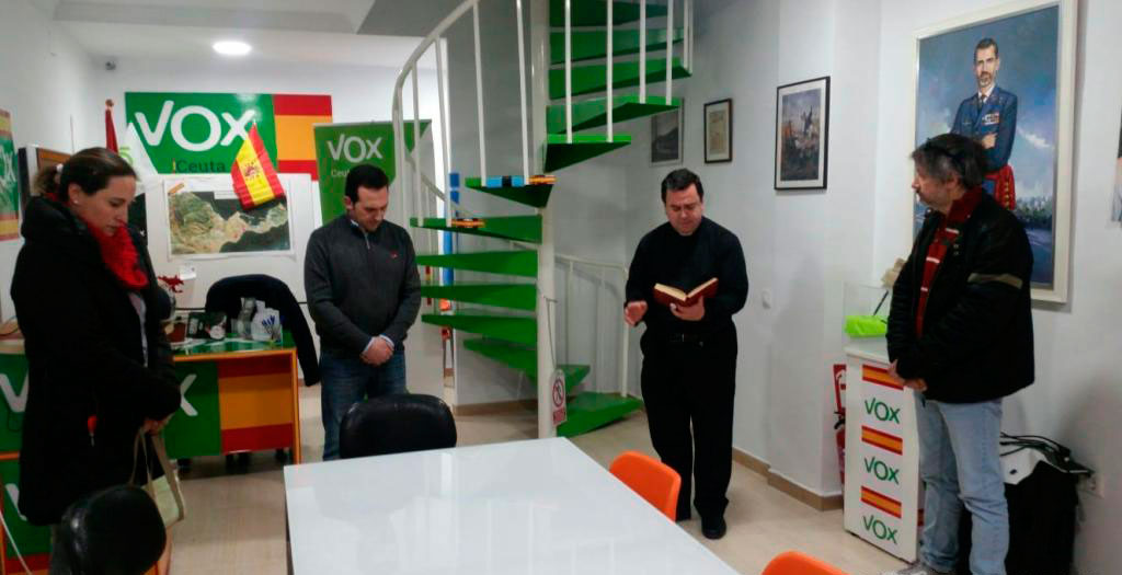 El padre Ignacio Fernández de Navarrete (Cádiz, 1974) bendijo el pasado 24 de enero la sede de Vox Ceuta y la oficina del grupo parlamentario en la Asamblea. El párroco de Nuestra Señora del Valle, que lleva desde 2013 destinado en la ciudad, pidió a la formación que tenga “sentido de responsabilidad ante España, la historia y el Señor”, según recoge El Faro de Ceuta.