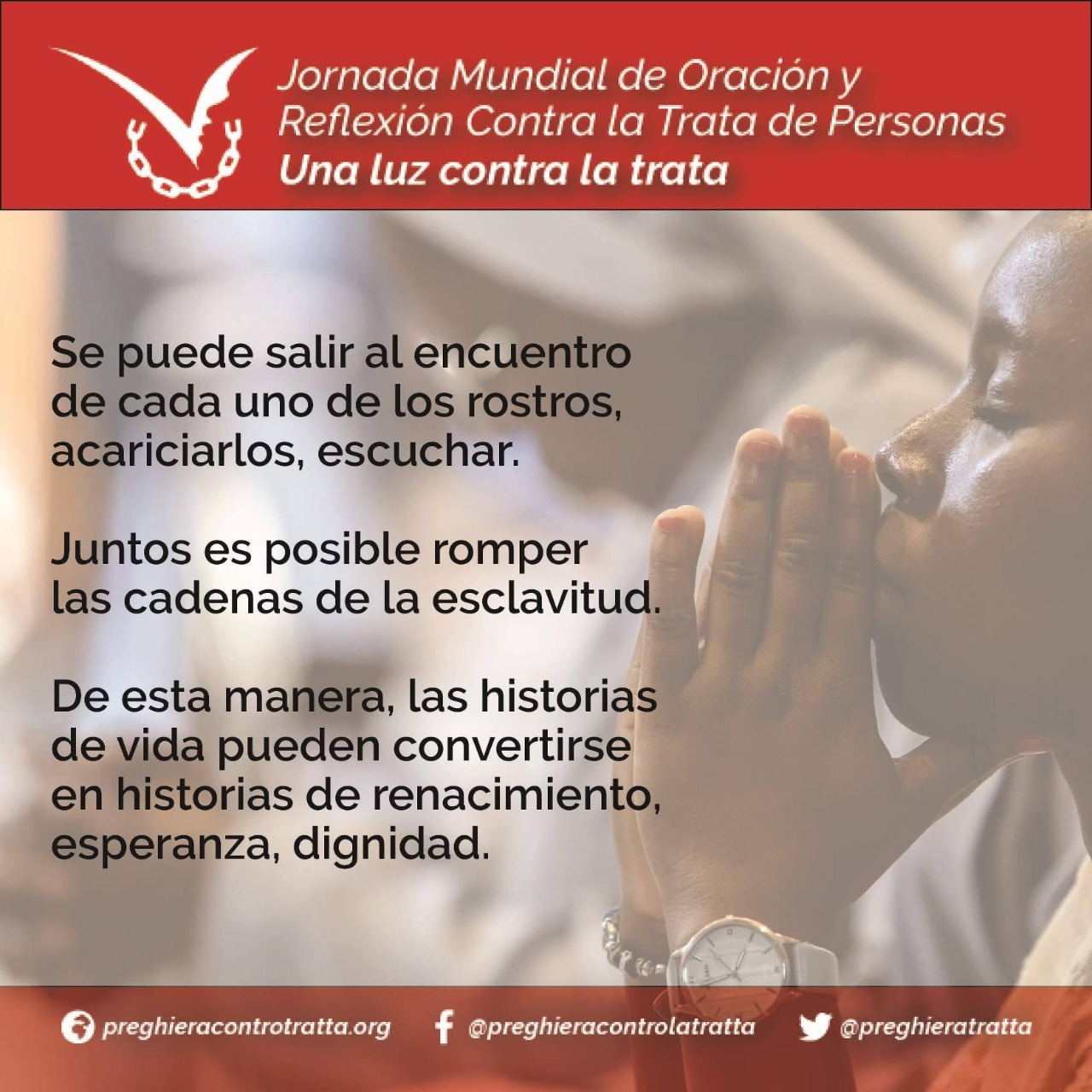 El 8 de febrero, festividad de Santa Josefina Bakhita, es la fecha instituida por el Papa para la Jornada Internacional de oración y reflexión contra la trata. La invitación de la CEMI convoca a a rezar y a generar sensibilidad y conciencia sobre el tema de la trata y tráfico de personas. Ofrecen material para descargar: una oración y un subsidio para la vigilia de oración.