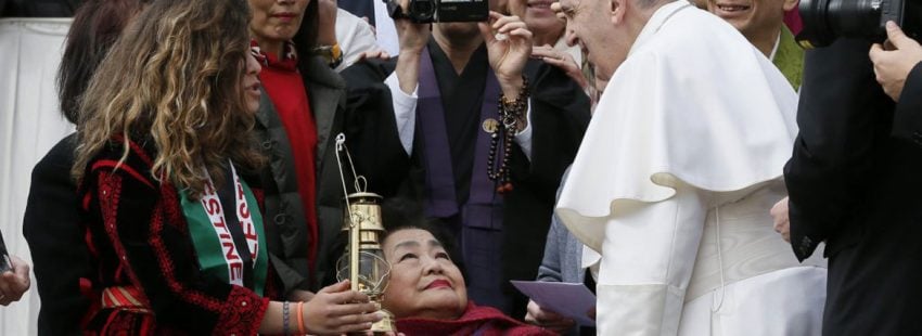 En un emotivo gesto al que se brindó el Papa en una audiencia general en marzo de 2019, Thurlow pidió a Francisco apagar definitivamente la llama del “fuego nuclear”, por lo que Bergoglio sopló sobre una llama sacada de las cenizas del bombardeo de Hiroshima que contenía una pequeña lámpara.