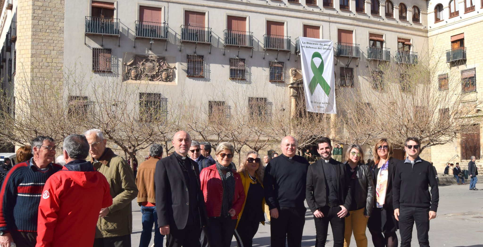 La curia de Jaén se ha unido esta mañana a la manifestación en defensa del olivar. Así, se ha descolgado una gran pancarta desde la fachada del obispado con un lazo verde en apoyo a los agricultores. El vicario general de la diócesis, Francisco Juan Martínez Rojas, y el vicario de Economía, Rogelio Garrido Checa, han acompañado la concentración en la plaza de Santa María de la capital.