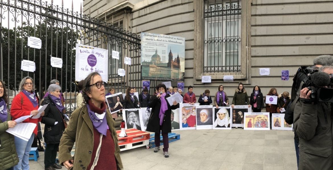 Cerca de 600 personas -según la organización- se han reunido esta mañana durante más de una hora en la explanada lateral de la catedral de la Almudena en Madrid respondiendo a la ‘Revuelta de mujeres en la Iglesia’ convocada por diversos colectivos eclesiales.