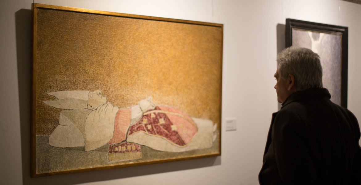 Cristino de Vera es, como afirma Ruiz, “el autor que más insistentemente, a partir de sus inicios en los primeros años 50 hasta prácticamente hoy mismo, ha mostrado ese interés por los temas religiosos”. De él se exhibe Papa muerto (1964), Cráneo y reloj de bolsillo (1972) y Crucifixión (1974). “En un principio, esa fe se manifestó a través de calvarios, de figuras yacentes y de orantes. Y a partir de entonces –continúa–, de una manera quizás más simbólica, mediante composiciones cruciformes, en las que la cruz está muy presente, y también otros símbolos religiosos, en alusión directa a la tradición simbólica cristiana”. Así que Cristino de Vera, como admite el comisario, era, indudablemente, “el mejor modo de arrancar cronológicamente el trayecto que hemos tratado de poner a la vista en esta exposición”.