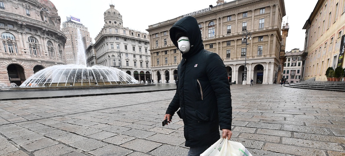 Genoa (Italy), 12/03/2020.- A person wearing a face mask and carrying bags walks in downtown in Genoa, northern Italy, 12 March 2020, during a national lockdown over the novel coronavirus crisis. Tougher lockdown measures kicked-in in Italy on the day after Italian Premier Conte announced the day earlier that all non-essential shops should close as part of the effort to contain the coronavirus. All of Italy is on lockdown until 03 April due to the novel coronavirus crisis. (Italia, GÈnova) EFE/EPA/LUCA ZENNARO