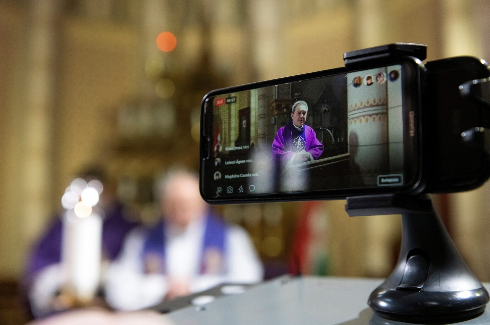 Nyiregyhaza (Hungary), 22/03/2020.- Hungarian priest Laszlo Felfoldi holds a mass via the internet in the Roman Catholic church of Our Lady of Hungary in Nyiregyhaza, Hungary, 22 March 2020. Public masses and ceremonies were suspended due to the spread of the ongoing pandemic of the COVID-19 disease caused by the SARS-CoV-2 coronavirus, so they are broadcasted on the social media. (Hungría) EFE/EPA/Attila Balazs HUNGARY OUT