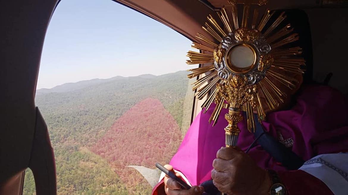 A través de Facebook Live, la Arquidiócesis de Toluca, Estado de México, transmitió este 26 de marzo desde las alturas una bendición muy especial. El arzobispo Francisco Javier Chavolla Ramos subió a un helicóptero, y con el Santísimo Sacramento, dos imágenes de la Virgen María, y una reliquia de san Juan Pablo II, sobrevoló el territorio arquidiocesano suplicando la protección de Dios para su grey, y el fin de la pandemia por coronavirus en el mundo.