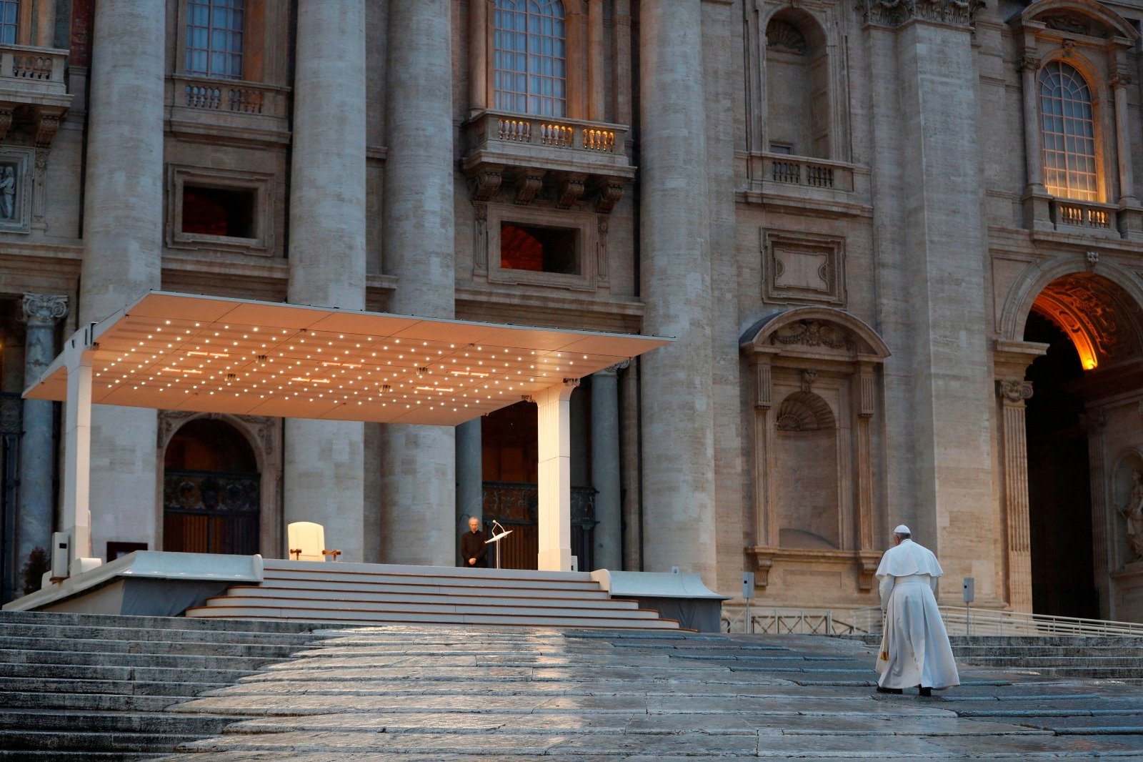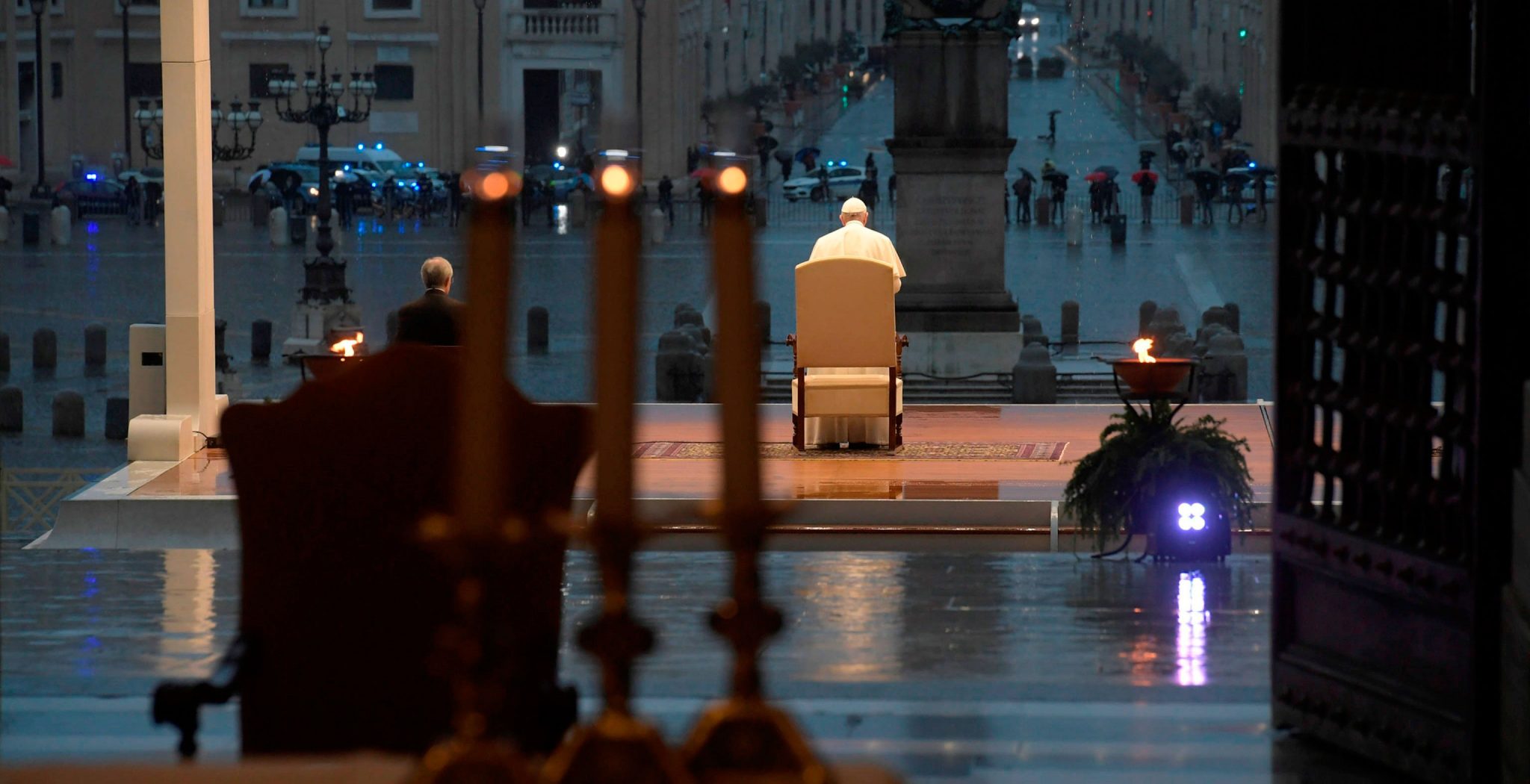 “Densas tinieblas han cubierto nuestras plazas, calles y ciudades; se fueron adueñando de nuestras vidas llenando todo de un silencio que ensordece y un vacío desolador que paraliza todo a su paso”, ha clamado el papa Francisco ante una Plaza de San Pedro totalmente vacía por el confinamiento debido a la crisis del coronavirus. Ante la pandemia, el Pontífice ha presidido un “momento extraordinario de oración” y, de forma excepcional ha impartido la bendición ‘Urbi et orbi’ –tradicionalmente reservada para Navidad, Pascua y la primera aparición de un pontífice tras su elección–. Además, en esta ocasión se ha hecho con la custodia con Jesús Sacramentado, algo también inédito.