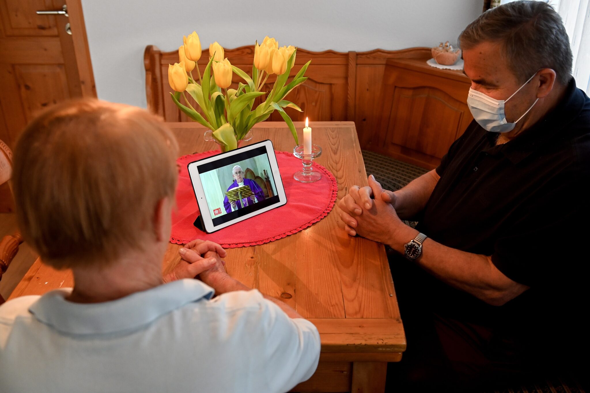 Kaarst (Germany), 27/03/2020.- A couple watches a live stream of the Vatican on their tablet in Kaarst, Germany, 27 March 2020. Pope Francis is holding a devotional service in view of the coronavirus COVID-19 crisis and delivers the special blessing Urbi et Orbi. This is a unique act in the history of the Vatican. The blessing Urbi et orbi is otherwise only given at Easter and Christmas, and also immediately after the election of a pope. (Papa, Alemania) EFE/EPA/SASCHA STEINBACH