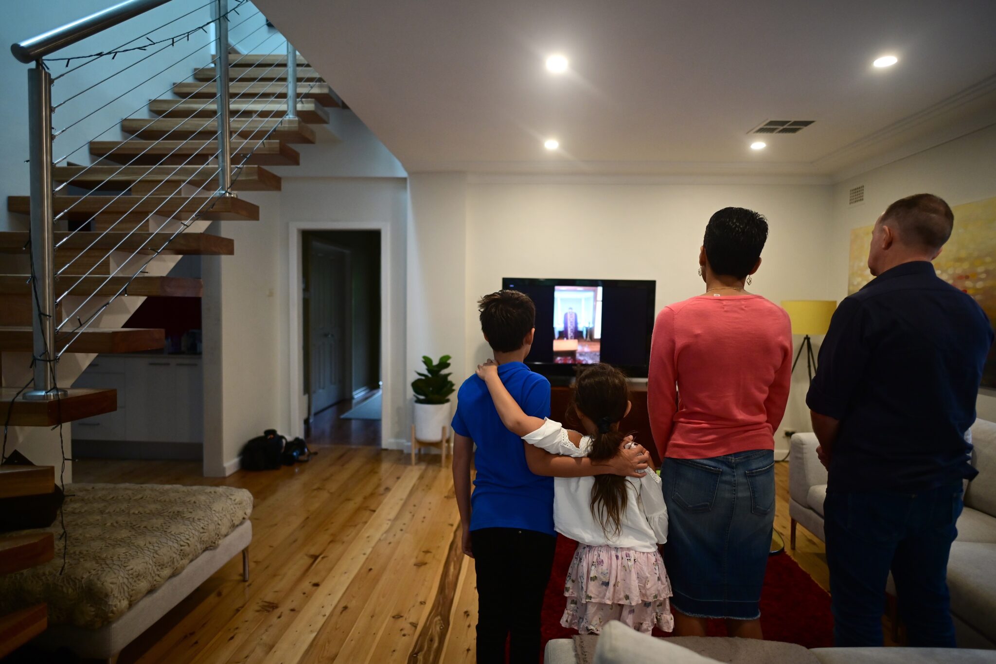 Sydney (Australia), 29/03/2020.- Members of the Munday family look at the TV in their living room as Bishop Richard Umbers (not pictured) hosts a livestream service from St Paul of the Cross church in Sydney, Australia, 29 March 2020. A shutdown of non-essential services is in effect in Australia in a bid to slow the spread of the coronavirus. EFE/EPA/JOEL CARRETT AUSTRALIA AND NEW ZEALAND OUT