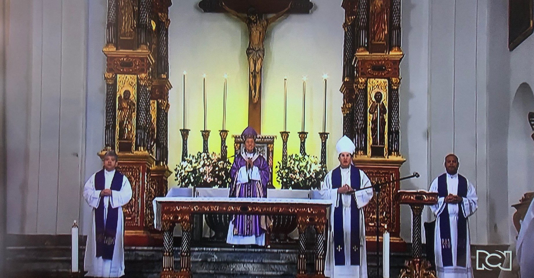 Como hace ocho días, cuando comenzaron las misas por televisión nacional presididas por el cardenal Rubén Salazar Gómez –debido a la cuarentena por la pandemia del coronavirus–, este domingo el arzobispo de Bogotá presidió la celebración dominical desde la Capilla del Sagrario a las 9 a.m., en compañía de Luis Manuel Alí, obispo auxiliar, y los presbíteros Jorge Marín y Carlos Castillo. Las cuatro religiosas que colaboraron en la liturgia, mantenían la distancia rigurosa –con una banca de por medio– y el cantante y el organista se ubicaban en el coro del templo.