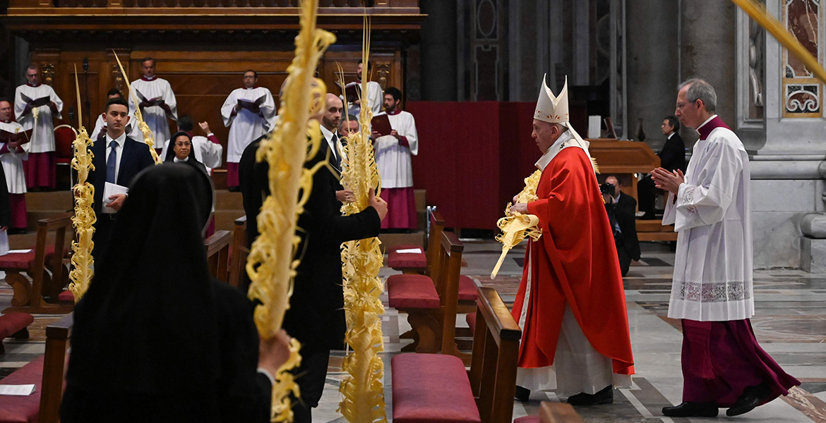 Ante una docena de personas, el pontífice ha bendecido unos ramos con la fórmula más sencilla todo en el interior del templo. Tres sacerdotes ha proclamado la lectura de la pasión según san Mateo –que este año no ha sido cantada–, las peticiones –que han incluido un recuerdo por “los gobernantes en este momento de prueba”– han sido todas leídas por el mismo lector en italiano y en la celebración se han guardado otras prevenciones como que el diácono no ha invitado a los presentes a intercambiar un gesto de paz –12 fieles en los bancos, además del clero, ceremonieros y coro reducido sin niños– o la preceptiva distancia social para recibir la comunión.
